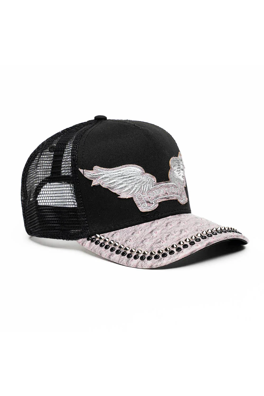 Blk/Grey ostrich twill trucker cap , signature silver embroidered wings, and a combination of silver SPIKE, Jet Blk crystal ,hand-studded in our newest pattern