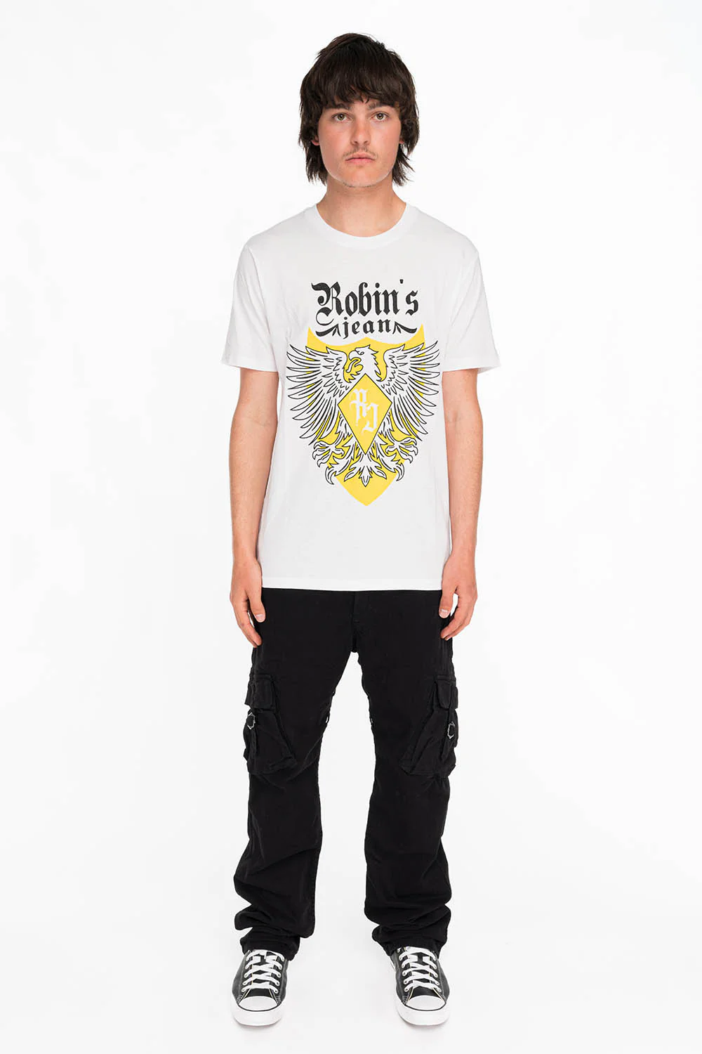 Robin's white Eagle Crest Tee with black glitter and yellow graphics