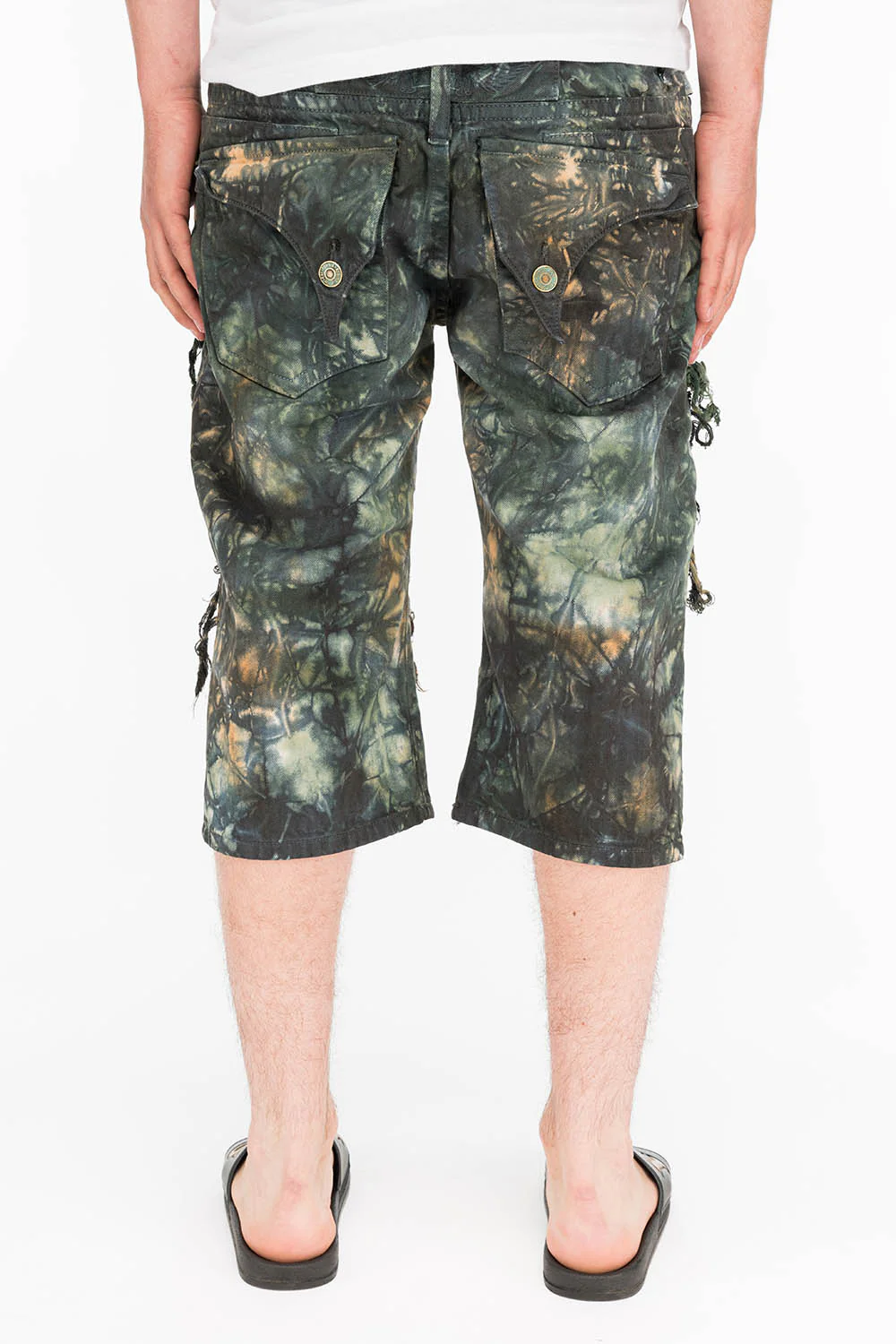 Robin's Jeronimo wash destroy shorts. These shorts are fully destroyed, patched and washed using a special green tie dye wash treatment. They have signature long flap pockets and are constructed using premium rigid denim for both style and durability.